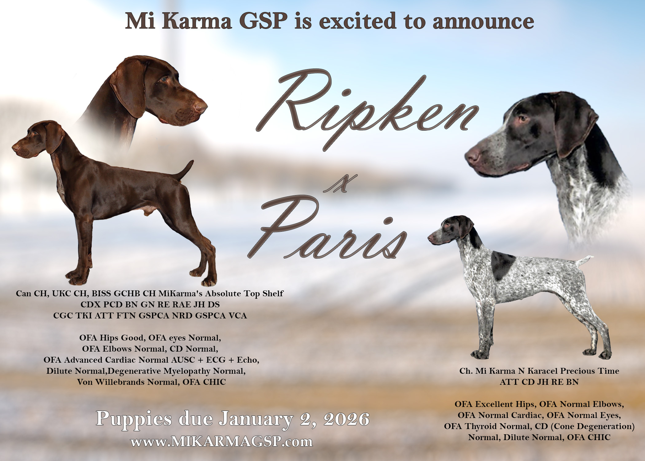 In keeping with our focus on health, temperament and versatility- these two have proven that they can do it all. Both parents are multi-titled, GSPCA VC recipients, OFA CHIC certified.